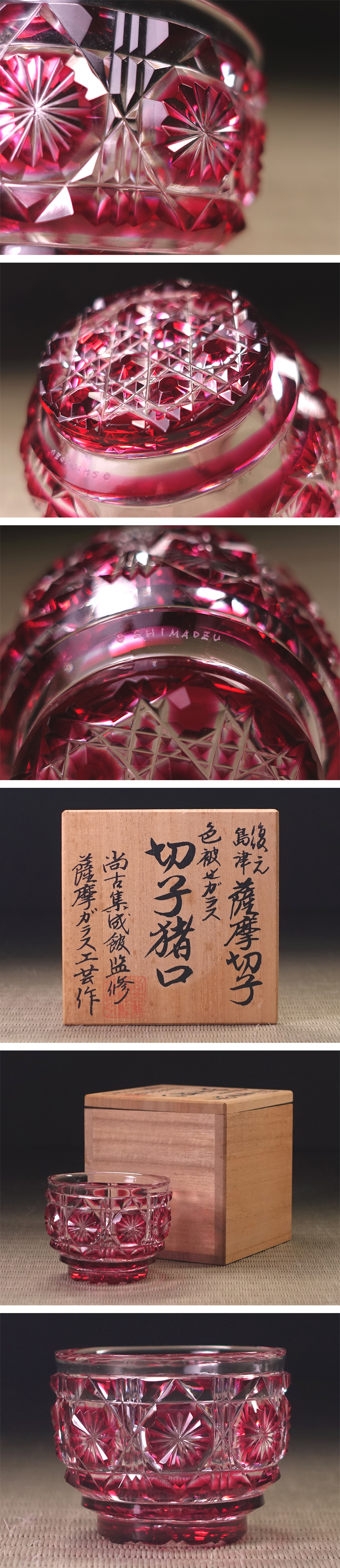 ∇花∇尚古集成館監修【薩摩ガラス工芸】作 復刻島津薩摩切子 銅赤被せ切子硝子猪口 菊花文酒盃 ぐい呑 共箱付 收藏