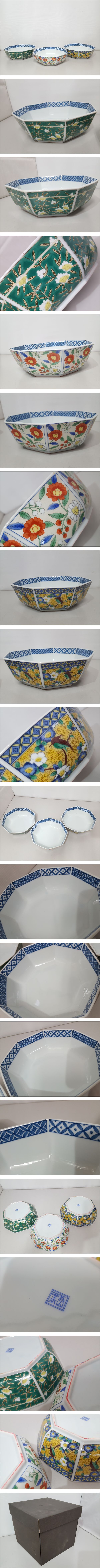 【うぶだし】吾山窯 造 絵変わり 八角鉢 合計3点セット/約19×6cm/花文/花鳥文/色絵/八角皿/盛鉢/盛皿/茶器/茶道具/LNY13-8 收藏