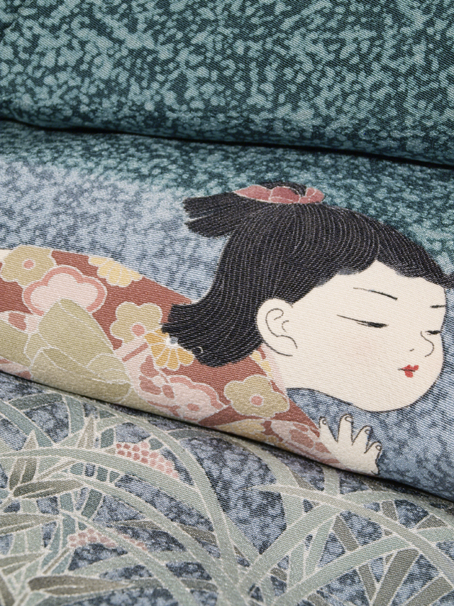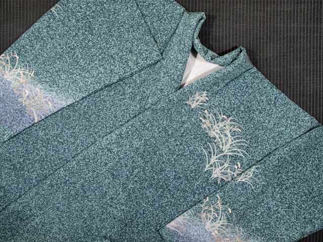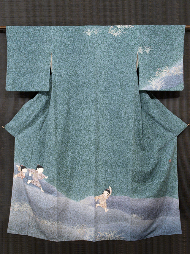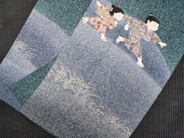 | 詳細 | 全体的な印象としては高麗納戸(こうらいなんど)色の地に、蝋叩き染めで霜降りの地紋が施され、野山で追いかけっこをする童子の文様が友禅染めされている訪問着です。袷仕立てです。童子図を得意とする友禅作家・関口良一氏のお作で左前衽に落款が染められています。 仲の良さそうな子どもたちがはしゃいで回る叙情豊かな情景が糸目の細い繊細なタッチの友禅技法であらわされています。ストーリー性が感じられる意匠なので、周囲の目も楽しませてくれそうですね。おままごとにも用いられるイヌダテ(赤まんま)が所々に配されていて、作家さんの意匠へのこだわりと愛情がこちらへも伝わってくるようです。 ユーズド品と思われますが、使用感はほとんど感じられません。右後身ごろ裾模様の女の子の口元に直径約 0.1mm のうすよごれが 1 か所ありますが、目にはつかず、気にはなりません |