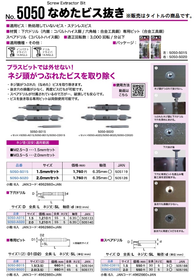 スターエム STAR-Mなめたビス抜き 下穴ドリル 2.0mm品番:5050-A020■仕様・サイズ:2.0mm・全長:55mm・ネジ丈:5mm・軸径:6.35mm