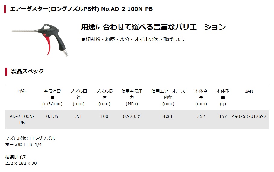 ベッセル VESSELエアーダスター(ロングノズルPB付) No.AD-2 100N-PB 用途に合わせて選べる豊富なバリエーション●切削粉・粉塵・水分・オイルの吹き飛ばしに。