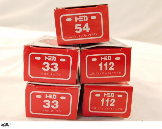 ① (青)トミカ/No.33/TOYOTA SUPRA/トヨタ スープラ/1994 TOMY/S=1/60 ②(赤)トミカ/No.33/TOYOTA SUPRA/トヨタ スープラ/1994 TOMY/S=1/60 ③(青)トミカ/No.54/SUBARU IMPREZA WRX/スバル インプレッサWRX/2000 TOMY/S=1/59 ④(赤)トミカ/No.112/MITSUBISHI PAJERO Jr./三菱パジェロJr.(キャリア付き)/S=1/56 ⑤(青)トミカ/No.112/MITSUBISHI PAJERO Jr./三菱パジェロJr.(キャリア付き)/S=1/56 ★No.54以外のトミカ4点は箱に【TOMICA 30th 限定】と書いてあります。 ★No.54は【メタルバッチ入り】と箱に書いてありますが欠品しています。