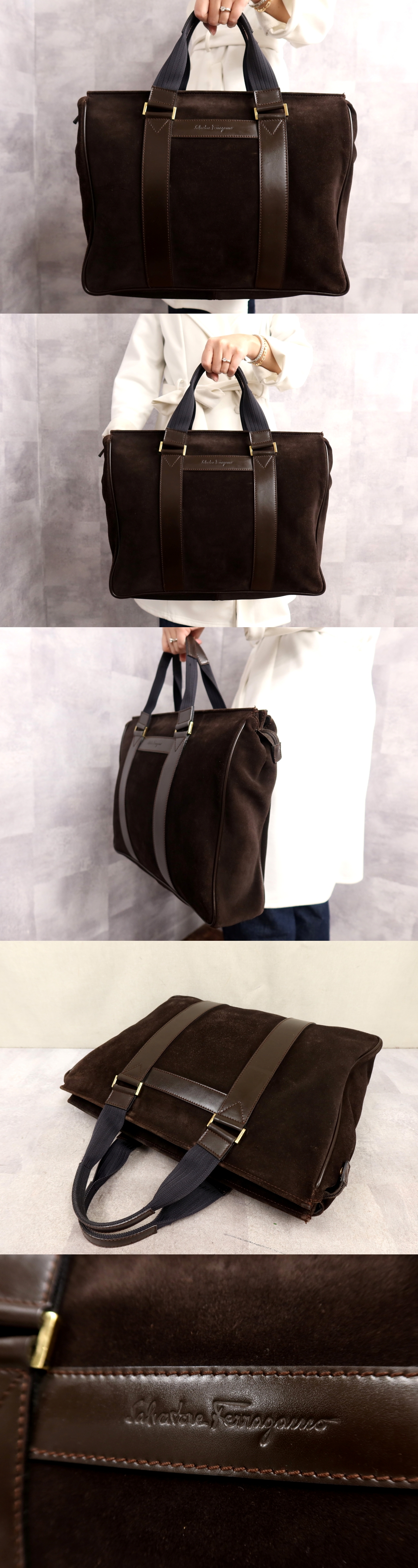 ●超美品●Salvatore Ferragamo フェラガモ●スエード カーフ レザー 本革●トート ビジネス バッグ●黒 茶●ゴールド金具●A4●Js64328 收藏