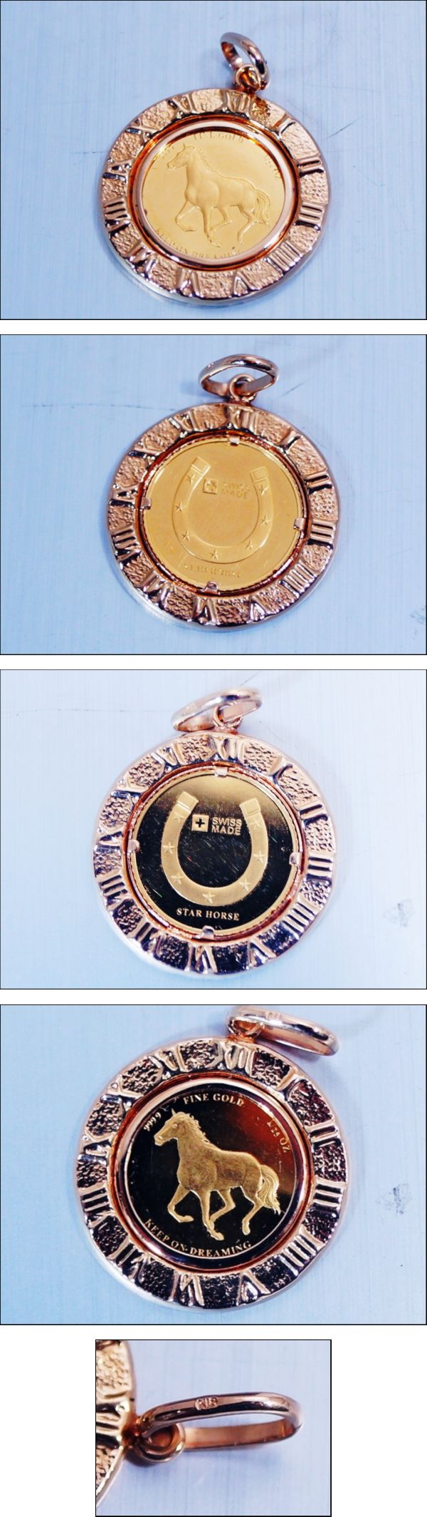 美品★純金999.9 1/25oz純金ホースコイン ペンダントトップ 18金枠 1/25oz 馬蹄 ゴールドコイン ペンダントトップ 枠K18刻印あり 24金 K24 18金 | |||