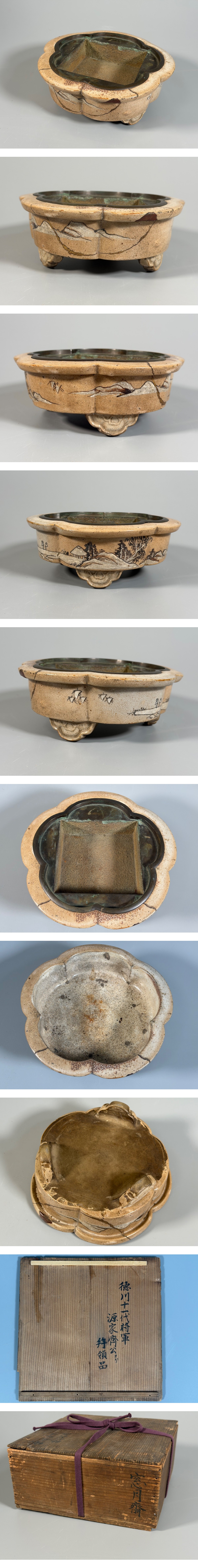 【小】5567 江戸期 絵瀬戸梅形風景文足付鉢 花器 銅落とし有 盆栽鉢 時代伝世箱有 伝来徳川家斉拝領品 窓月斎所持 水盤 收藏