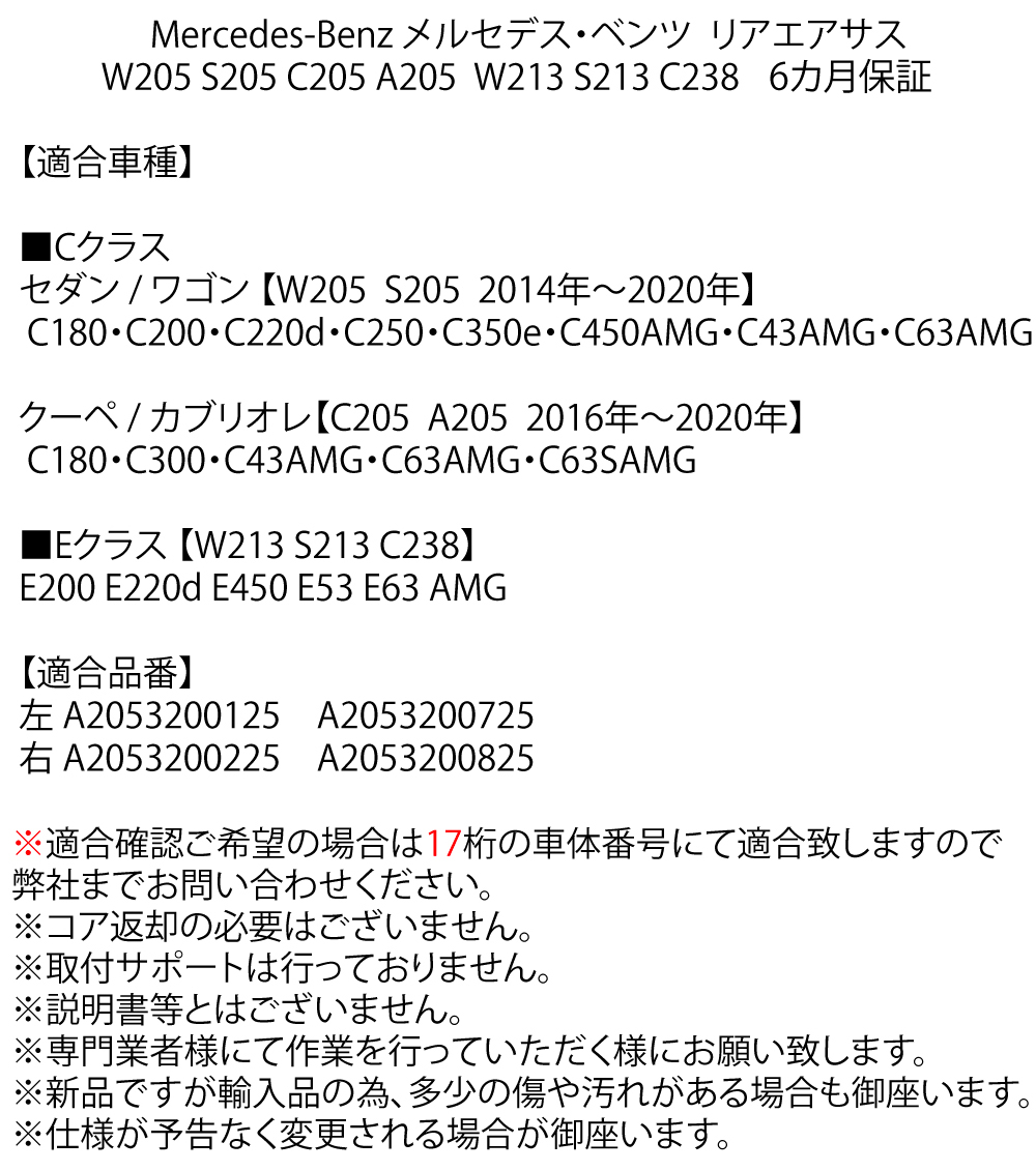 | 商品名 | ベンツ W205 W213 Cクラス Eクラス リア エアサス 左右 2本SET エアサスペンション A2053200125 A2053200225 |