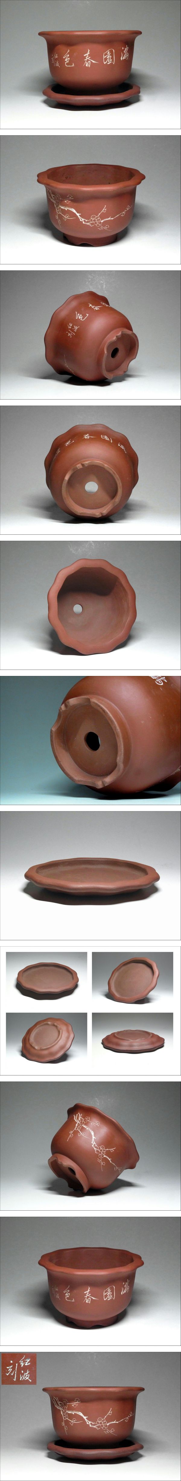 | 商品説明 | 中国古玩 唐物 [紅波刻]銘 梅図 漢文字釘彫 中国宜興紫砂 朱泥 輪花植木鉢 盆栽鉢です。 使用品ですので多少の汚れ・擦れ等は御座いますので御了承下さい。 とても形・図柄の良い、見映えのする朱泥鉢です。 [サイズ] 本体 高さ13cm 直径21cm 台 高さ3cm 直径20.5cm |