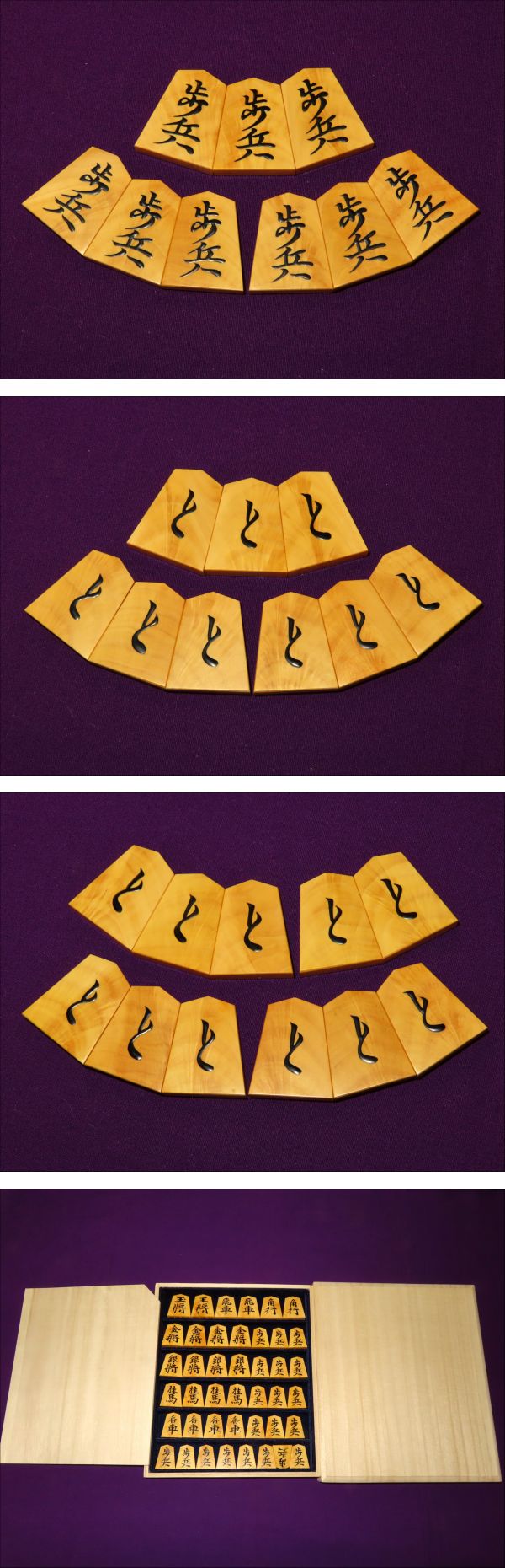 木地は薩摩黄楊孔雀杢。ご覧のとおり非常に味のよい木地です。全ての駒の表裏をUPいたしましたので是非ご覧ください。