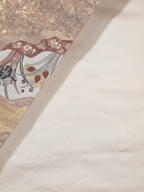 | 詳細 | 全体的な印象としては、金色、紫水晶色、藍鼠(あいねず)色、京紫色、焦香(こがれこう)色といった感じの道長取りの地に、唐草や波、霜降、切箔のほか、唐花や杜若、松竹梅、楓などの草花、宝尽くしなどのさまざまな小紋が入った丸の文様が織り込まれている西陣織の袋帯です。 品の良いかわいらしさと格調高い渋みが感じられる意匠で、幅の広い年代でお召しになれます。いろいろな種類の文様が精緻に織り込まれ、周囲の目も楽しませてくれそうです。 ユーズド品で、前の折り跡がうっすらとあるほか、胴回りの柄抜け部分に直径約 1cm のうっすらとした黄変が 1 か所、裏地に、直径約 1mm のよごれが 1 か所ありますが、気になるようなものはありません。そのほかに目につくしみやよごれ、褪色などのダメージはなく、全体的にはとてもきれいな状態です。 |