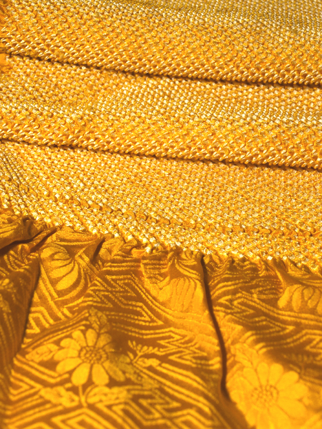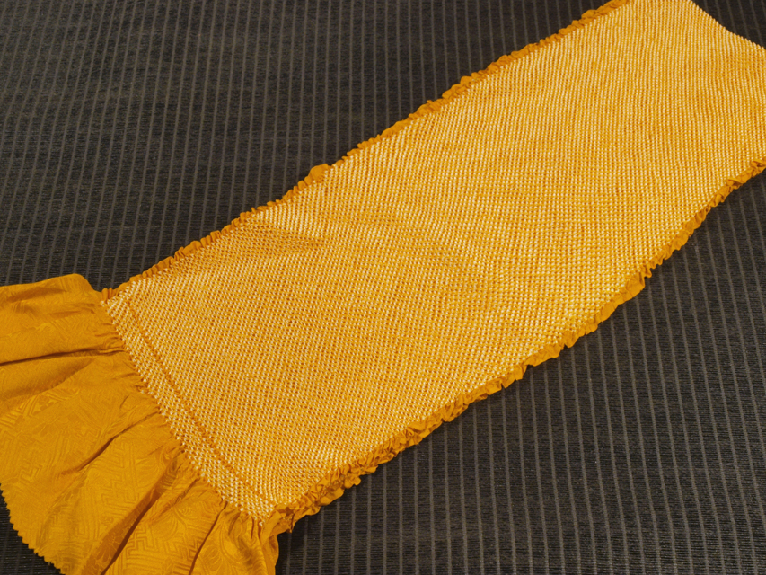 詳細  蜜柑(みかん)色の地に、本紋(紗綾形に花)の地紋が織り出され、総絞り染めが施されている綸子の帯揚げです。