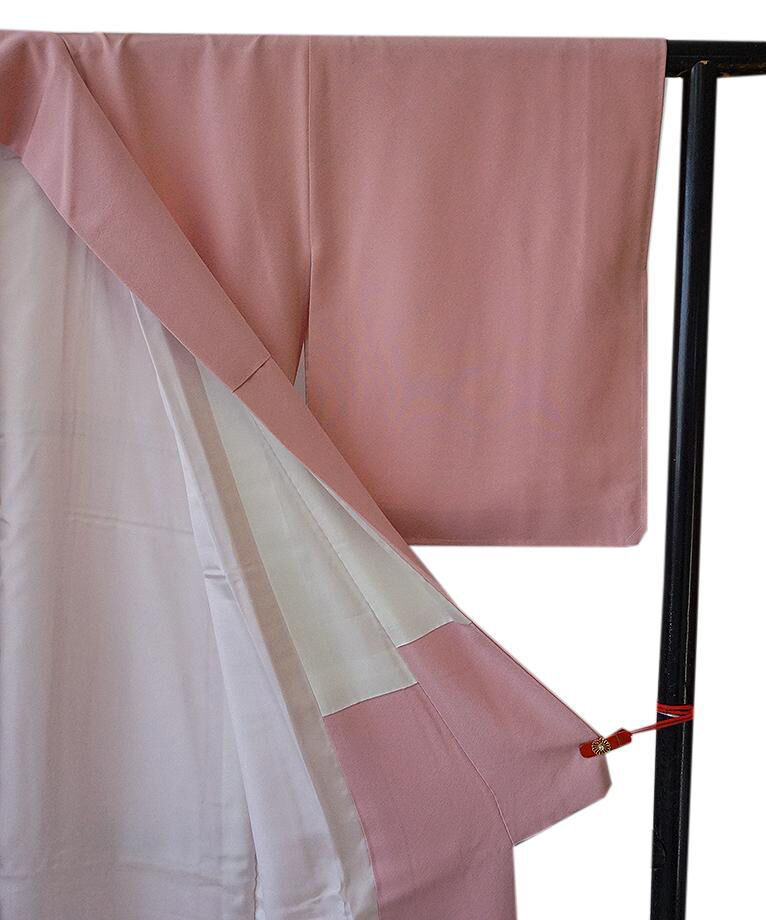 | 商品説明 | こちらのお品は「袷」ですので10月から5月までお召頂ければと思います。 とてもしなやかで滑らかな手触り良い堅牢染の重めの極上ちりめん地です。 柔らかな鴇色地の無地着尺となっております。 共八掛、背には「丸に梅鉢」の紋が1ヶ入っております。 |