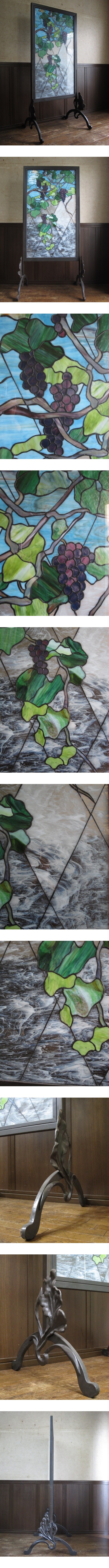 希少 逸品 ステンドグラス 葡萄文様 鋳物フレーム 衝立/パーテーション/間仕切り/大正/昭和レトロ/色ガラス/ガラス工芸/アンティーク 收藏