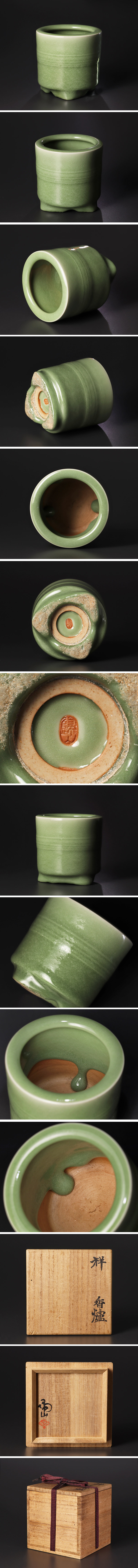 翠の釉薬は、よく見ると透き通るような繊細さを湛えています。見込みに大胆に溜まった釉が景色となり、静と動が響き合う、印象深い香炉です。