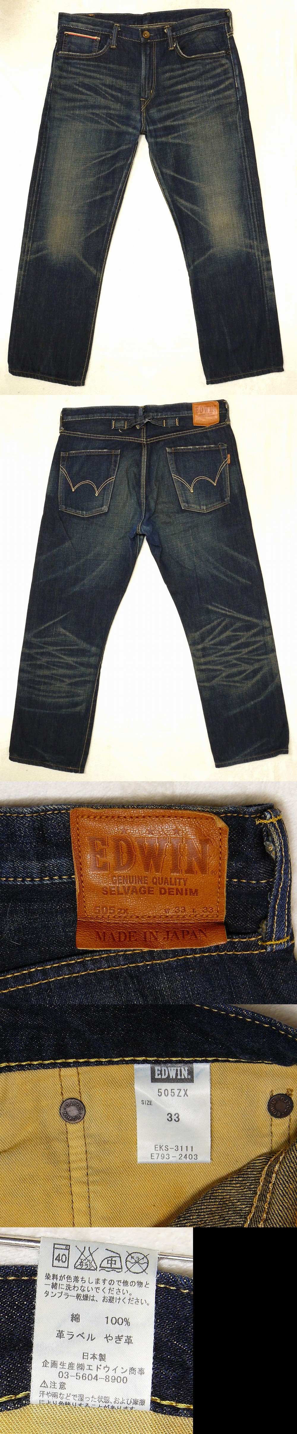 ☆ご覧いただきありがとうございます。 【ご入札される方は必ずコメント欄も含めお読みください。】 ■ ■ ■ ■商品詳細■ ■ ■ ■ 品名: EDWIN 505ZX (エドウィン 505ZX) 素材: セルビッジデニム(赤耳)を使用しており、コットン100% シルエット: ややゆったりとしたルーズストレート ストレッチ: ストレッチ素材ではありません サイズ: W33(ウエスト) 品番: EKS-3111 着用シーズン: 11.5オンス程度の厚みで、通年着用可能です サイズは必ず実寸でご確認ください。 実寸