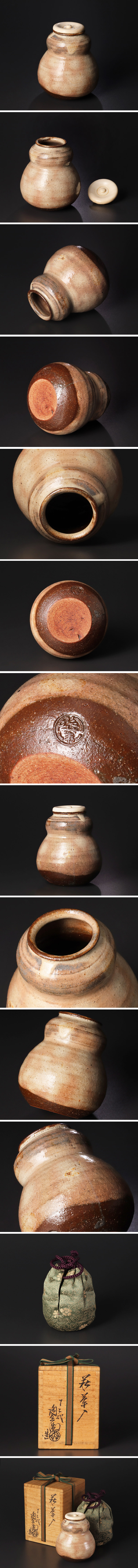 瓢箪を思わせるやわらかな形に、萩焼特有の土のぬくもりが溶け合い、静かで温かみのある佇まいを見せる茶入れです。定家緞子の仕覆が付属いたします。 ★商品は十二代田原陶兵衛の作品である事を保証致します。 |