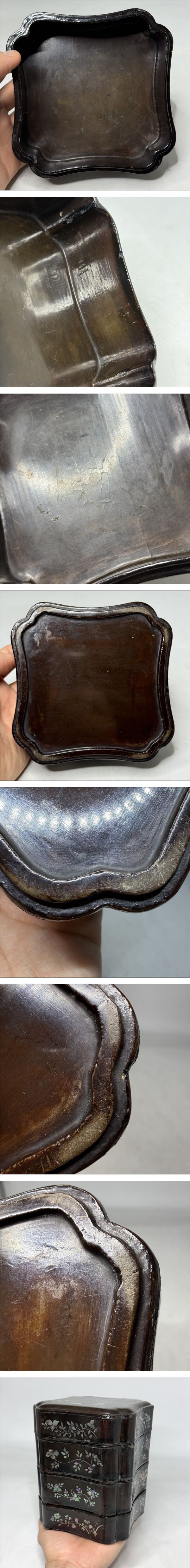 時代物 書道家放出品 明朝期 大漆螺鈿象嵌山水人物、花卉文四重盒 古物保証 時代直し 共箱(堆朱 剔紅 漆器 唐物 文房具 中国美術 煎茶道具 收藏