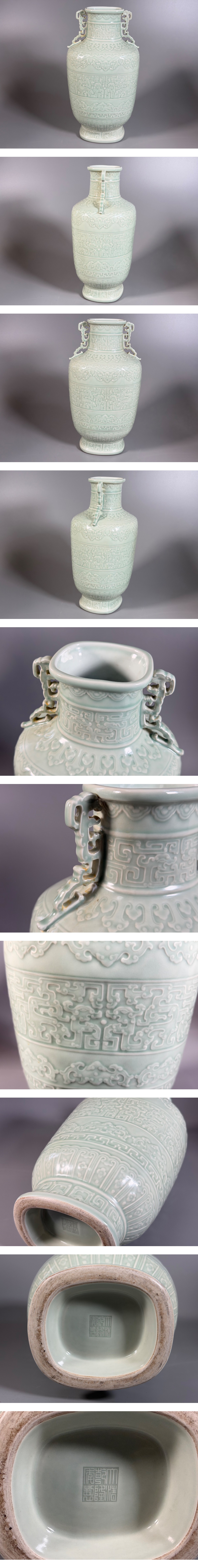 【小】5561 コレクター収集買出品 中国古美術 大清乾隆年製銘 青磁龍饕餮文耳付壺 花生 粉青釉 花瓶 中国古玩 唐物花瓶 清 收藏
