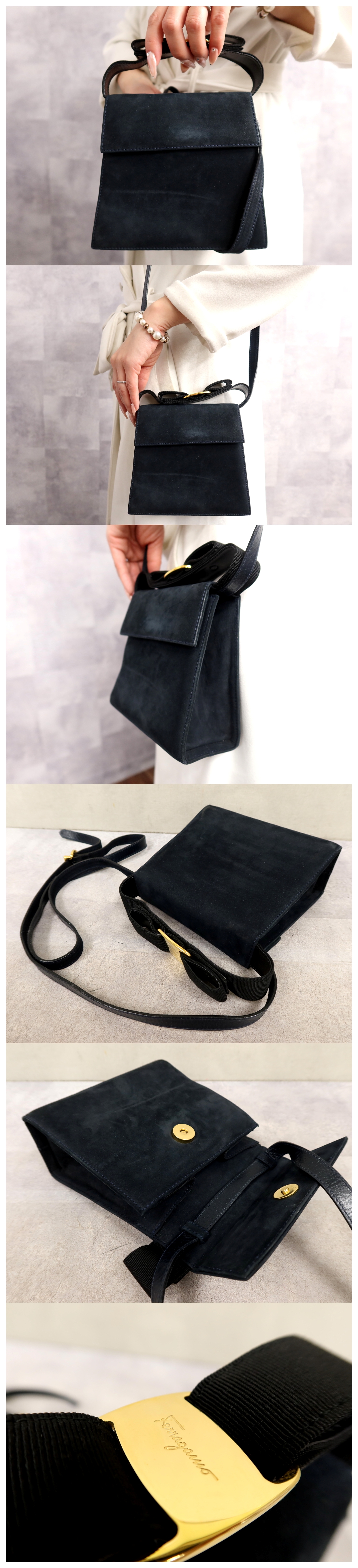 ●超美品●Salvatore Ferragamo フェラガモ●ヴァラリボン●スエード レザー 本革●2way ハンド バッグ●ダークネイビー●G金具●Js65093 收藏