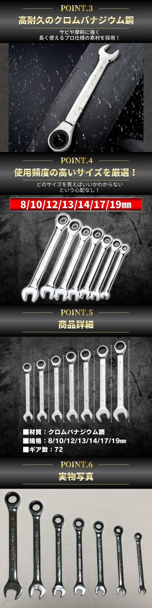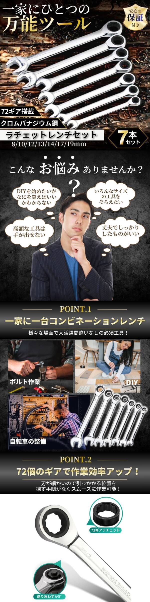 | ・ギア数:72山 ・セット内容:7本セット ・サイズ:8mm / 10mm / 12mm / 13mm / 14mm / 17mm / 19mm ・素材:クロムバナジウム鋼(高耐久) ・仕上げ:鏡面メッキ仕上げ | |||