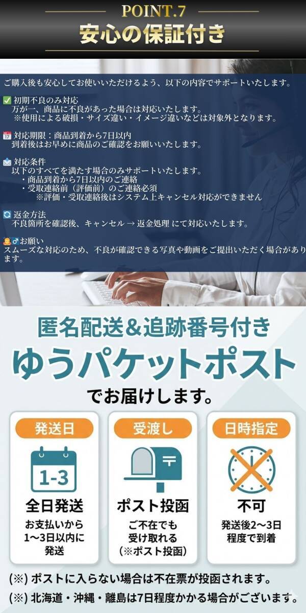 | ・発送方法:ゆうパケットポスト(匿名配送・追跡あり) ・発送目安:お支払い確認後2~3日以内 ・到着目安:発送から2~3日程度(地域により変動あり) ※簡易包装での発送となります | |||