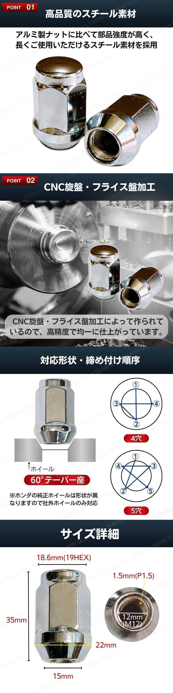 ホイールナット M12 P1.5 35mm 19HEX スチール 袋 ナット テーパー 16個 トヨタ マツダ ホンダ ダイハツ ミツビシ いすゞ クロム ツバ 4穴 收藏