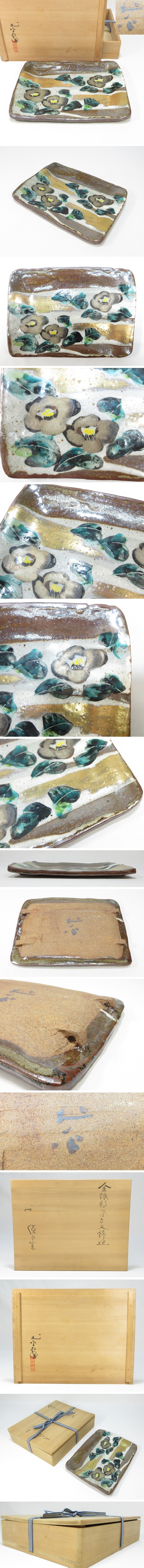 【A0809】廣永窯 名工『 坪島 土平(川喜田半泥子の愛弟子)』作 四方皿 題『 金銀彩つばき文 飾皿 』共箱 本物保証 收藏
