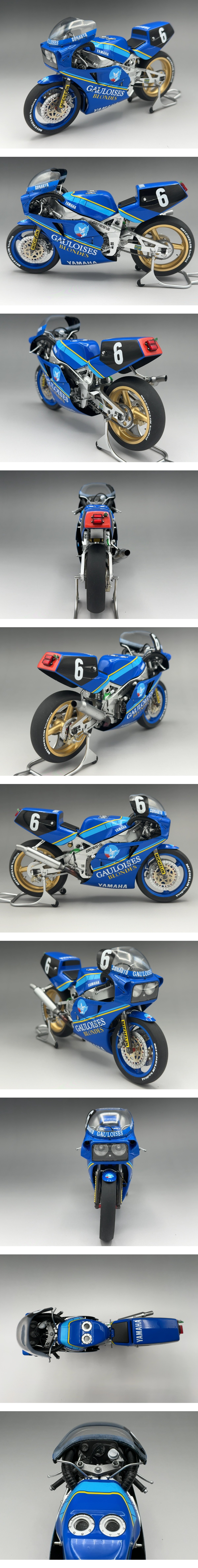 | 商品説明 | 【基本制作】 ●ボディカウルはグレーサフ→ホワイトサフ→インディブルーの手順で塗装し、デカールを張り付けた後、オートクリアーを数回吹き重ね、軽く研ぎ出ししてから最後にコーティングポリマーにてフィニッシュしました。 ●その他のパーツにつきましても、全てサフがけしてインストに従って塗装してあります。 ●塗装は基本的に全てエアブラシにて行いましたが、ボルトなどの細部に関しましては一部筆塗りの箇所もございます。 ●アッパーカウルとアンダーカウルは接着してありますので、取り外すことは出来ません。予めご了承ください。 【追加加工】 ●社外製デカールを使用してゴロワーズ(タバコのロゴ)を再現 ●アッパーカウル、サイドカウル、シートカウルのリベットは、全て別売りの金属製リベットに置き換えております。 ●ブリーザーホースのファスナーを極細ワイヤーにて自作。 ●パイピングに使用したケーブルコードはスケールに合わせて細い径のものに変更しております。 ●ステアのグリップワイヤーを極細金属線にて再現。 ●前後のソリッドゴム製タイヤはサンドペーパーにてラインを消した後、軽く半ツヤブラックを吹いて整えてあります。 ●デカール類は全てツヤ有りもしくは半ツヤクリヤーにて保護してありますので、経年劣化による剥がれや割れの心配はございません。 ●その他の細部につきましては、掲載画像をご参考ください。 ![]() powered by auction-labo.com | |