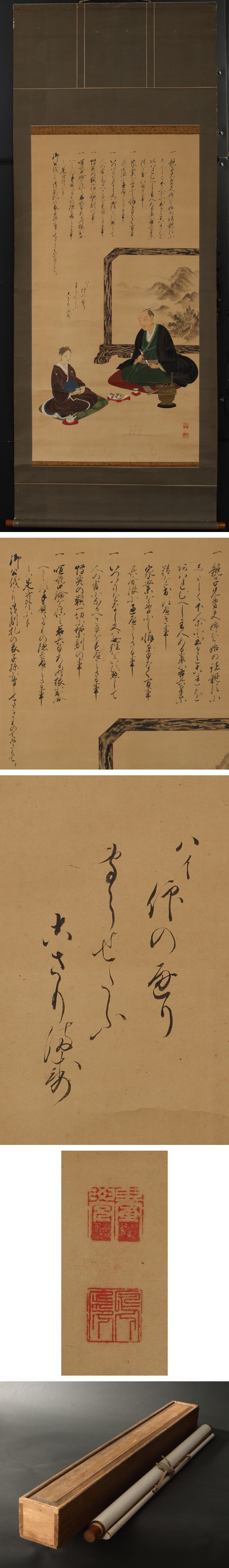 江戸後期の商家夫婦像です。 賛は「親子兄弟札」と呼ばれる正徳元(1711)年の高札の条文を挙げ、子孫に守らせることを厳命する内容となっております。夫妻の対話形式となっているのが興味深い所です。 江戸初期には高札は老中の後退や年号変更の度に改訂されましたが、「親子兄弟札」は明治6(1873)年の高札場廃止まで掲示され続け、特に行商人たちにとっては宿場町ごとに目にする身近な存在でした。また、万民に周知させるために出版が奨励され、寺子屋では手習の手本として重宝されました。 この高札を教化に役立てたのが石門心学者たちで、特に中沢道二は「親子兄弟札」を講釈の折々に朗読し、「神儒仏の和合」「天の御言葉、天の御声」と絶賛したことが知られます。心学は近江商人に人気を博し、全国の商家の家訓に取り入れられました。 宣徳火鉢の前で煙管をふかしながら、煎茶を夫婦で楽しむ姿は、当時の豪商の流行が如実に顕われたものでしょう。江戸の町人の日常が刻み込まれた逸品です。 ◆中沢道二 江戸中期-後期の心学者。家業の織職をつぐ。40歳をすぎて禅をまなび,のち手島堵庵に師事。堵庵の要請で,天明3(1783)年江戸に心学講舎参前舎をつくり,関東・中部・東北地方に心学をひろめた。享和3(1803)年没、79歳。京都出身。名は義道。通称は亀屋久兵衛。著作に「道二翁道話」など。 〔本文〕 (夫) 一 親子兄弟夫婦を始め諸親類に したしく下人等にいたるまてこれを あはれむへし主人ある輩は各其奉公に 精を出すへき事 一 家業を専にし懈(おこた)る事なく万事 其分限に過へからさる事 一 いつはりをなし又は無理をいひ惣して 人の害になるへき事をすへからさる事 一 博奕の類一切に禁制之事 一 喧嘩口論を慎み若其事ある時猥(みだり)に出合 へからす手負いたる者隠し置へからさる事 とは是此外にも 御公儀より御制札の表子孫に守らせたきものて御さるてな (妻) ハイ仰の通り 守らせたふ こさります 付属:時代箱が付属します。 寸法:高さ172cm、幅66cm(最大幅。若干の誤差はご了承下さい) 状態:経年のイタミがございます。 |