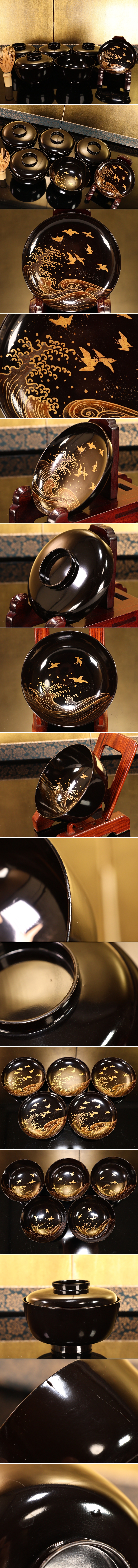 BK507 時代輪島塗 波千鳥金蒔絵 吸物椀 五客 木製 茶道具 懐石 菓子 收藏