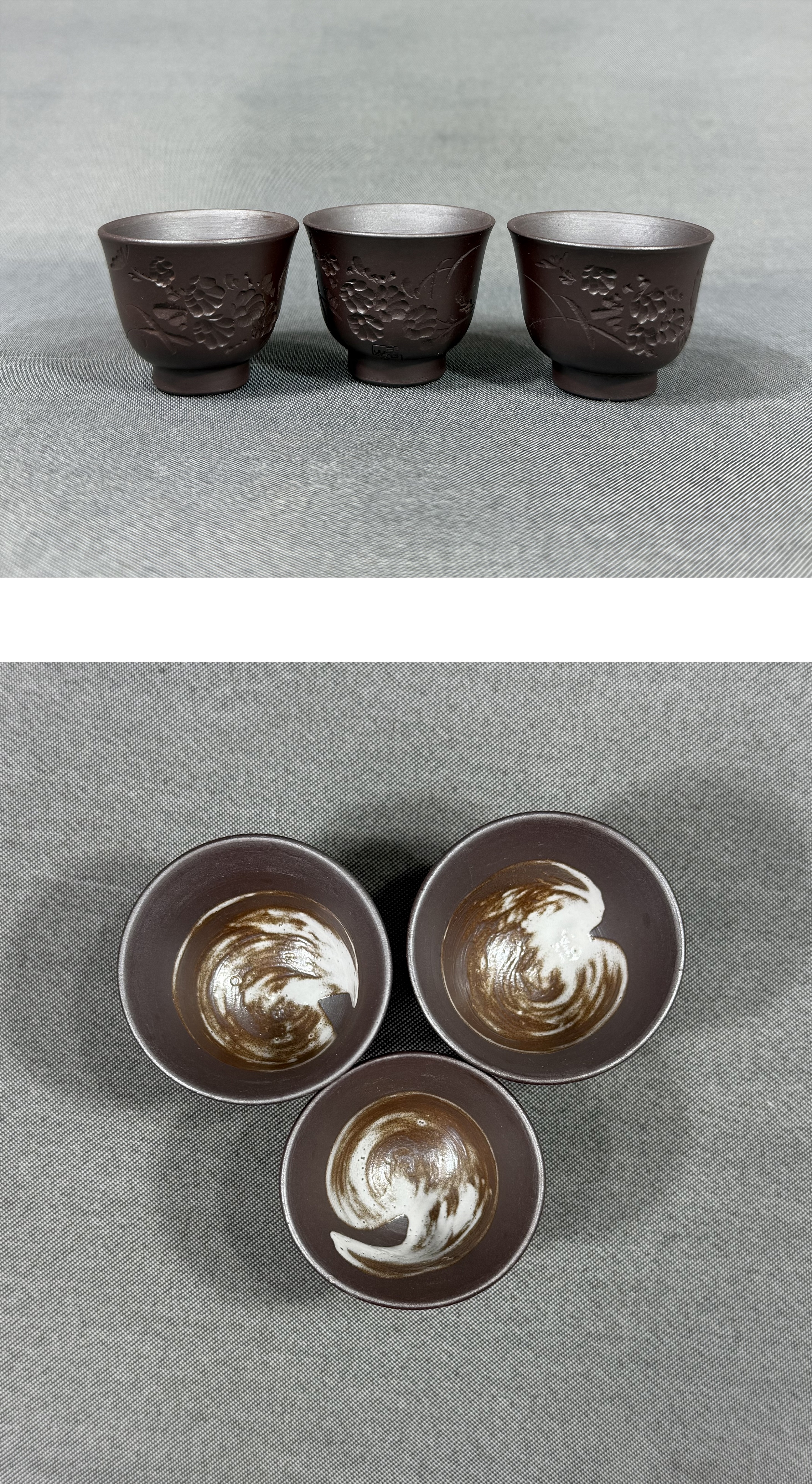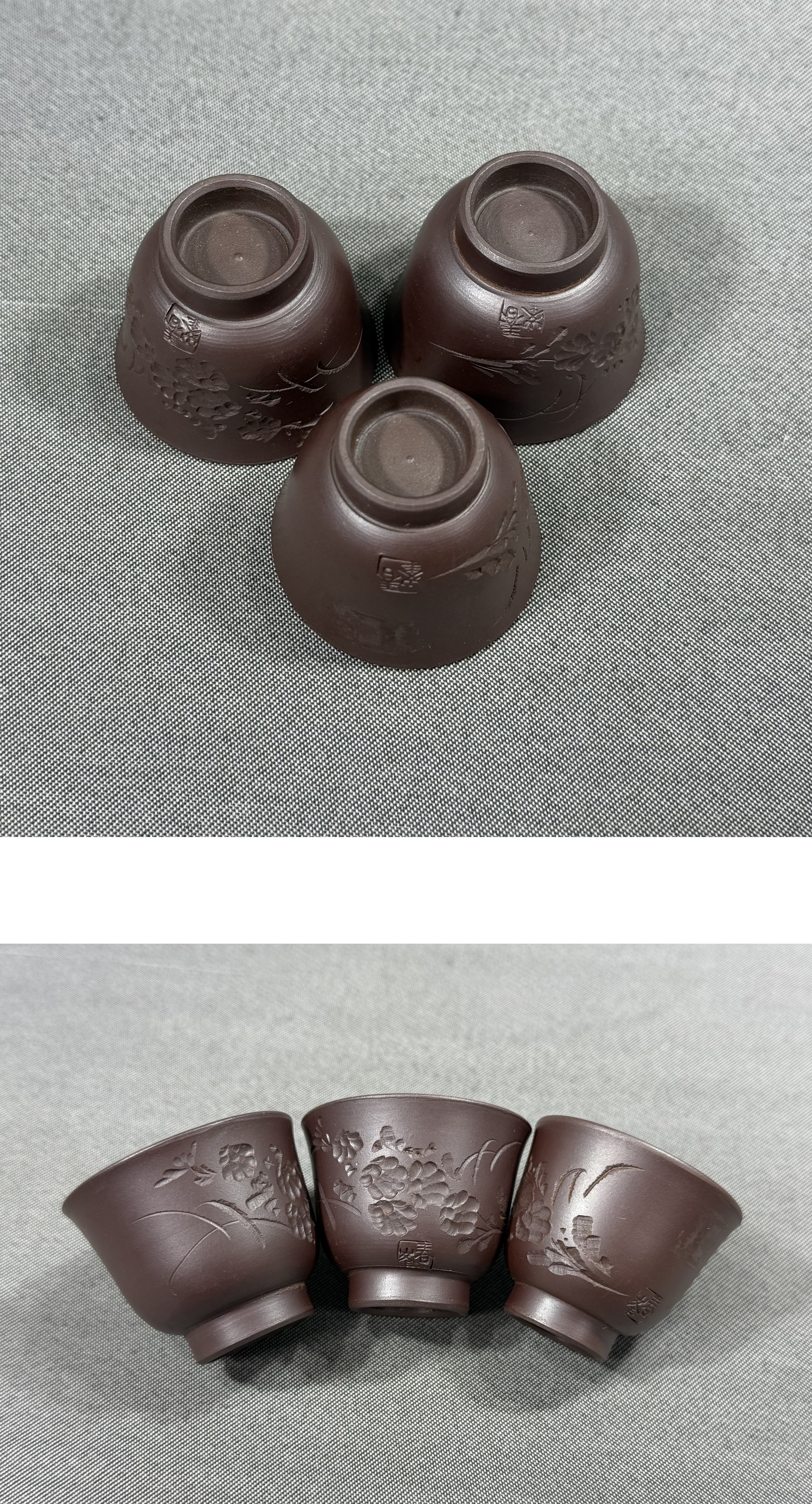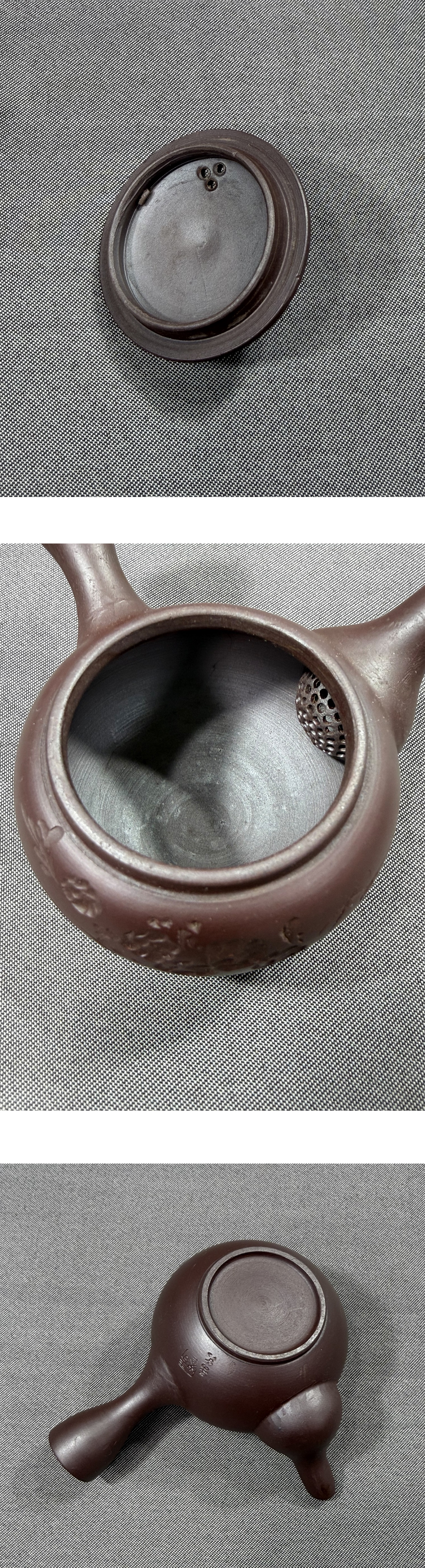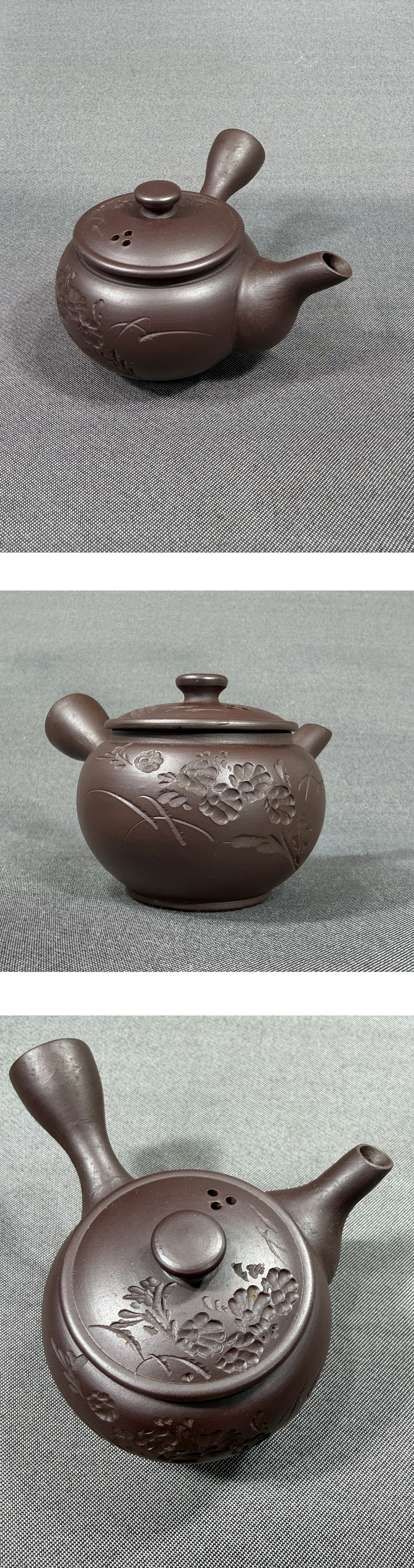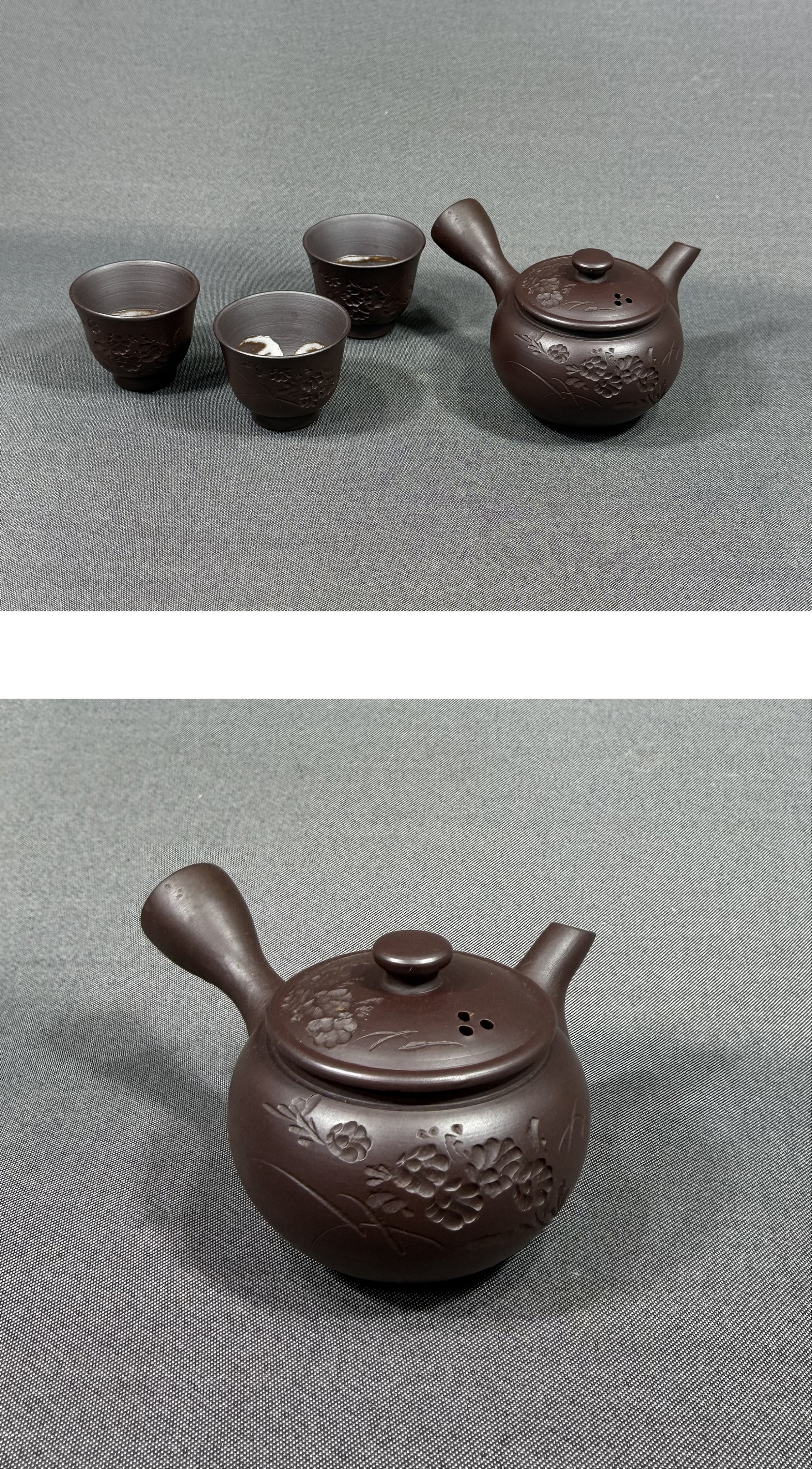 【風車】萬古焼 名工 春峰(伊藤卯吉) 菊文 茶器 急須 茶碗3客▲在銘▲三重県の人 通産大臣賞 知事賞 県会議長賞▲茶道具 煎茶道具 收藏