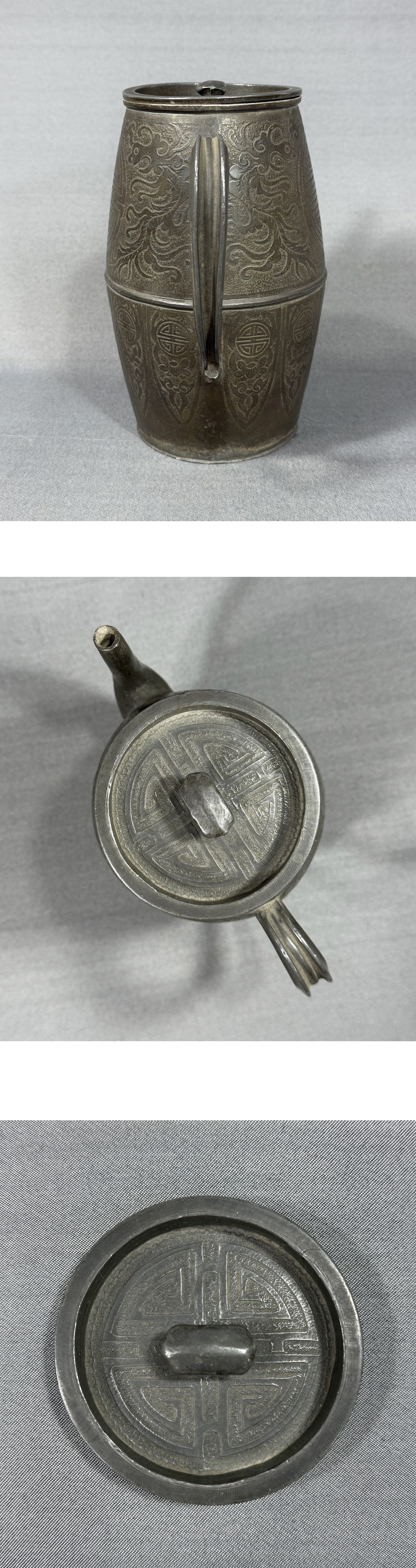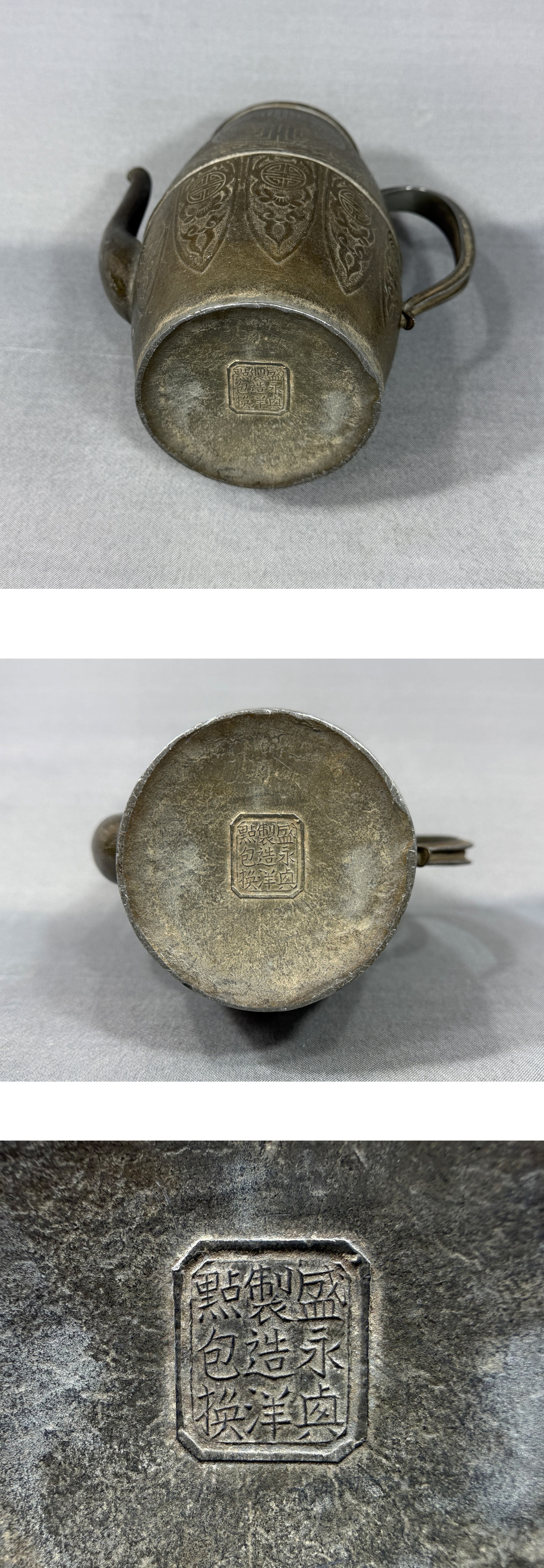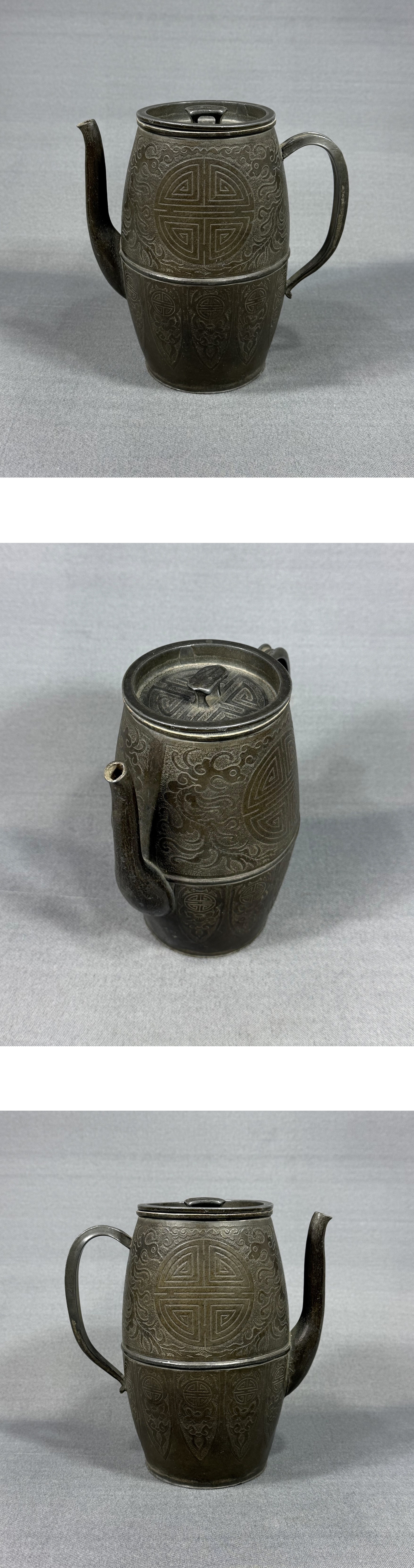 【風車】清代 錫製 鳳紋 寿 茶注 酒壺 款:「盛永興製造洋点包換」▲875g▲中国美術 細密 高級品 骨董品 急須 唐物 收藏
