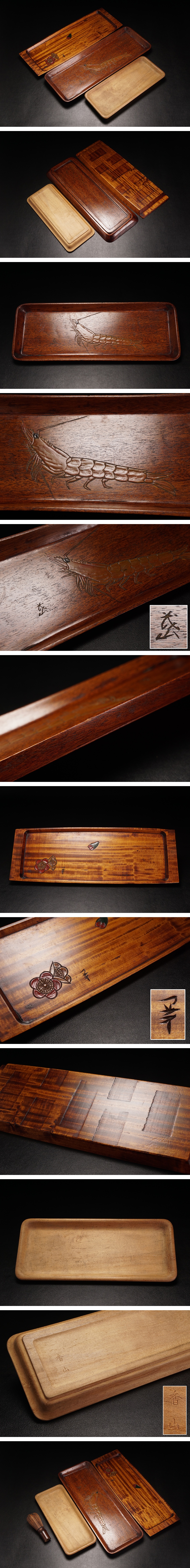 【茶の器特集】NS03◆煎茶道具 茂山 香山 他 木彫 海老紋 花紋 一文字盆 煎茶盆 在銘◆茶器 茶盆 買取品 蔵出し 売り切り 古美術 收藏