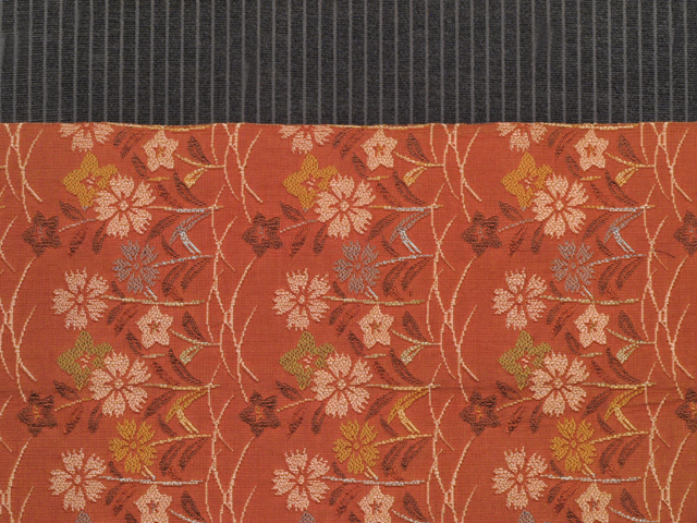 | 詳細 | 沈んだ雀茶色の地に、露芝と桔梗(ききょう)、撫子(なでしこ)の文様が織り込まれている、変わり織の八寸名古屋帯です。 落ち着いたかわいらしさのある意匠で、どこかニットのような趣きが感じられます。さらりとした紬のような手ざわりで、ややざっくりとした織地です。 ユーズド品で、前の折り跡があります。また、画像では判別はつきませんが、たれの中央左寄りのかいきり線下に直径約 3~5mm のうすよごれが 2 か所ありますが、地色に沈んでいて、あまり判別はつかず、気にはならなさそうです。そのほかに目につく大きなしみやよごれなどのダメージはありません。 |