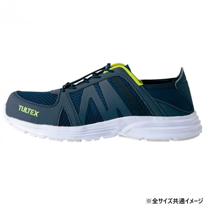 | スポーティーなデザインのセーフティシューズ。踵を踏んでも違和感なく、屋内外両方の作業に最適です。つま先部分には樹脂製の先芯が装備されています。 |