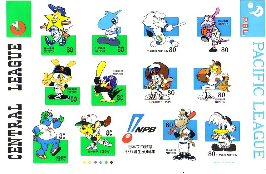 「日本プロ野球セパ誕生50年周年」の記念切手です (80円切手X12枚)。送料は普通140円(普通便 複数同梱発送では180円)になります。