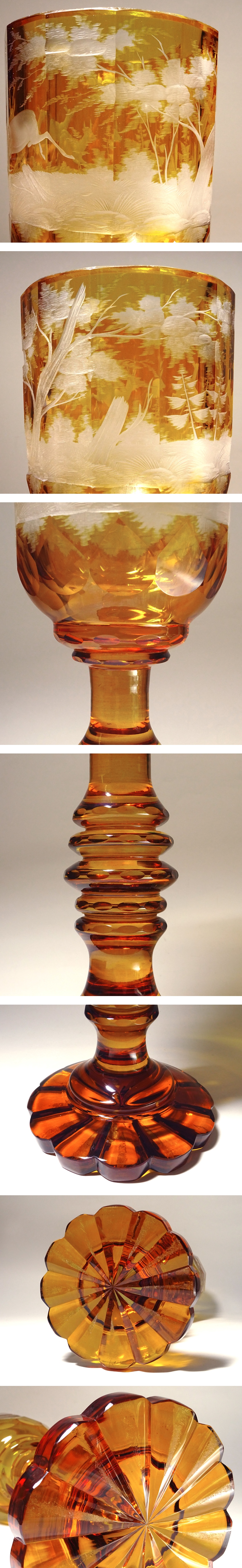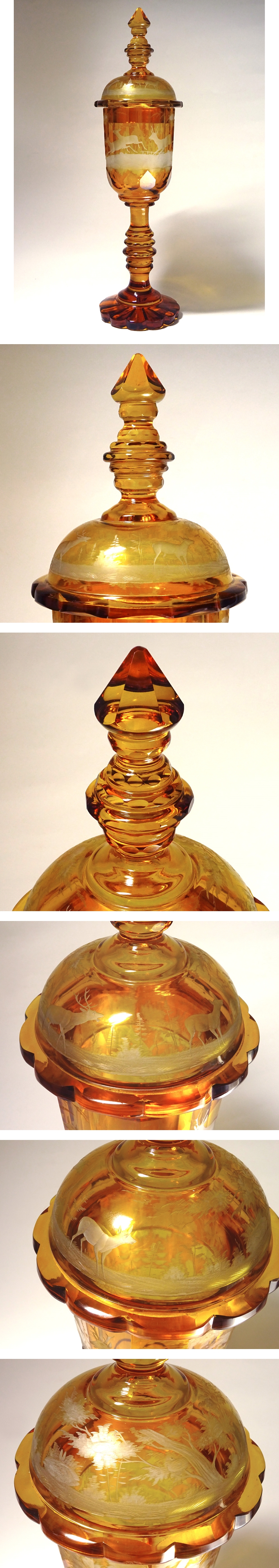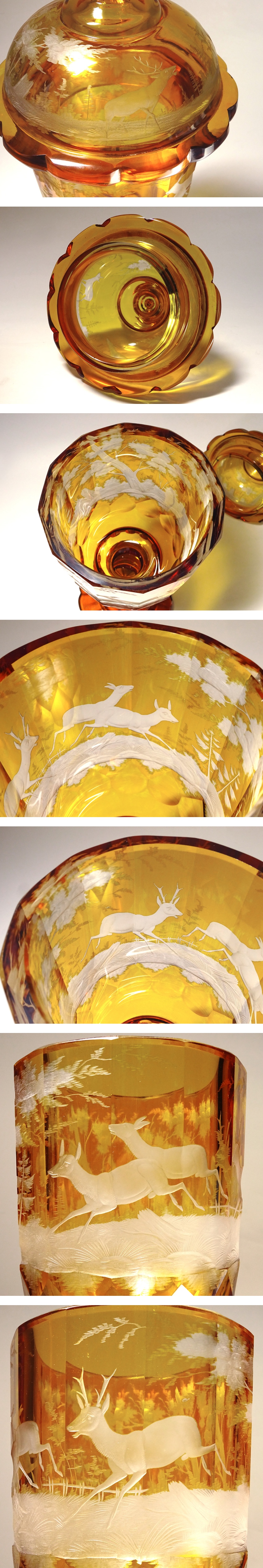 慶應◆ヴィンテージ ボヘミア アンバー被せガラス エングレーヴィング(グラヴィール)森鹿トナカイ文蓋付き飾壷 高さ55cm 收藏