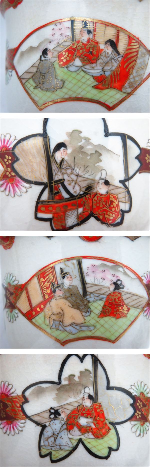 ◆◇時代物 九谷製銘 金襴手 金彩 赤絵 扇桜窓 人物図 湯呑 5客 ぐい呑み 茶器 煎茶道具 アンティーク ◇◆ 收藏