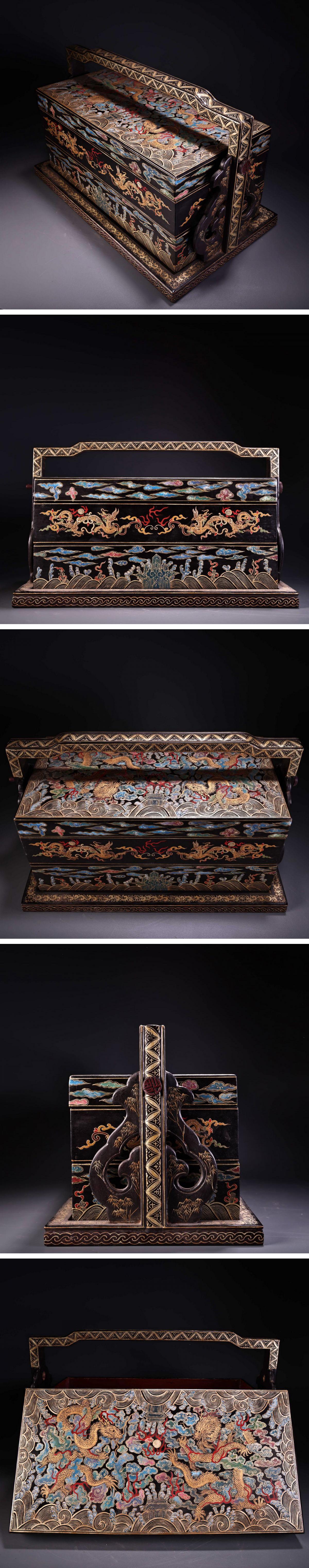 【清】関西某オークション購入 中国 清時代 木胎漆塗 雲龍紋金蒔絵重箱 極細工 古置物 古擺件 中国古美術7L12-EW5 收藏