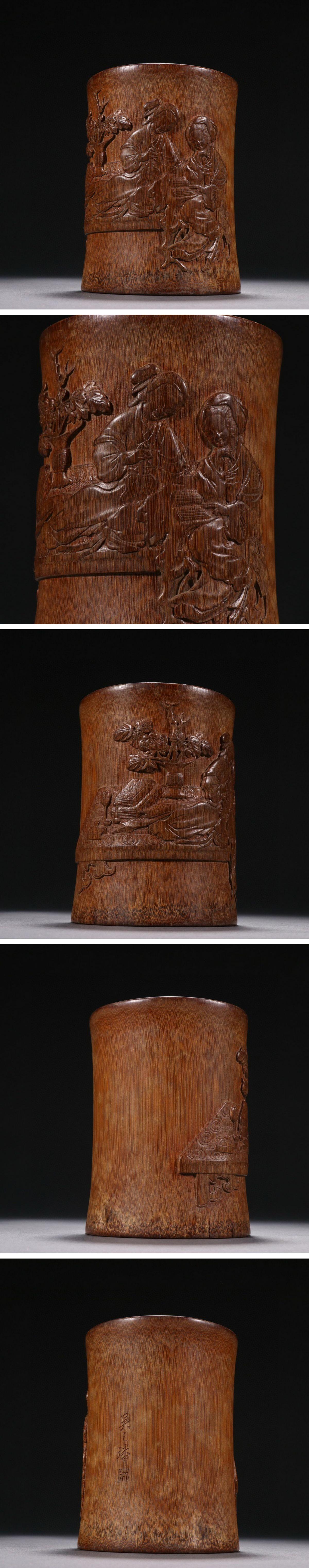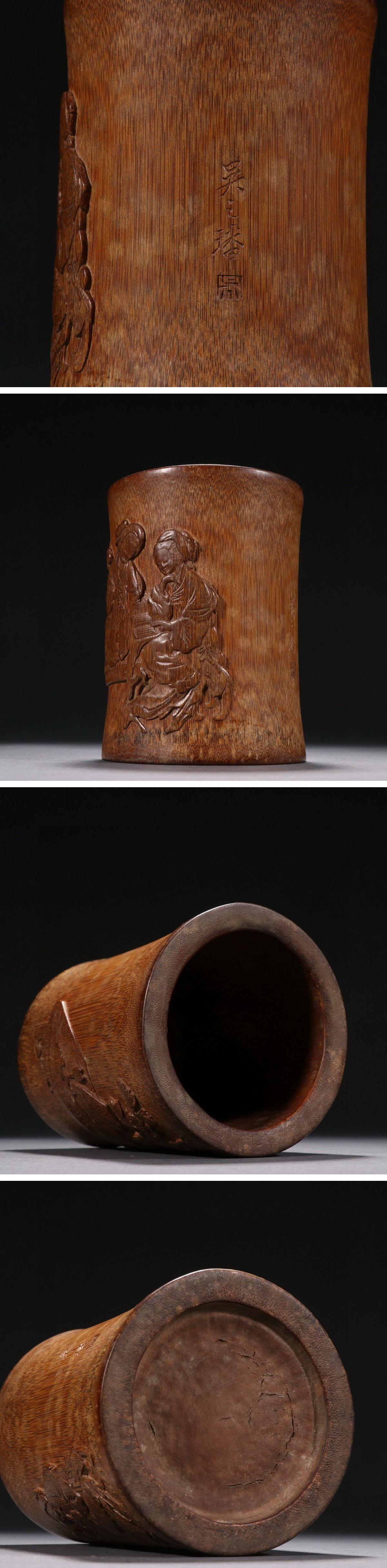【清】関西某オークション購入 中国・清時代 古竹彫り 人物紋筆入 極細工 古置物 古擺件 中国古美術7L12-PQ6 收藏