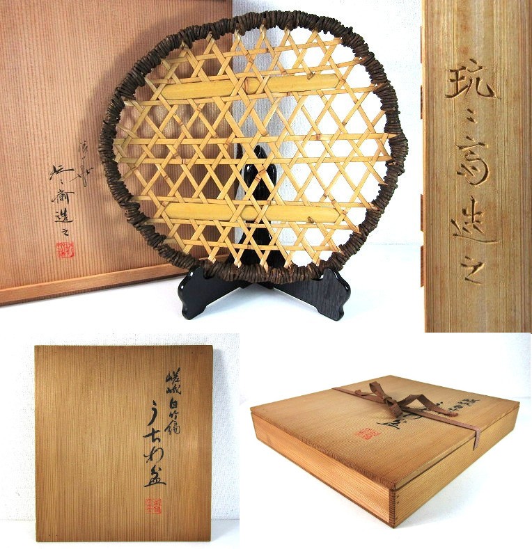 浪華 鈴木玩々斎 造 嵯峨白竹編 うちわ盆 菓子盆 共箱【説明欄に詳細写真有り】の出品です。