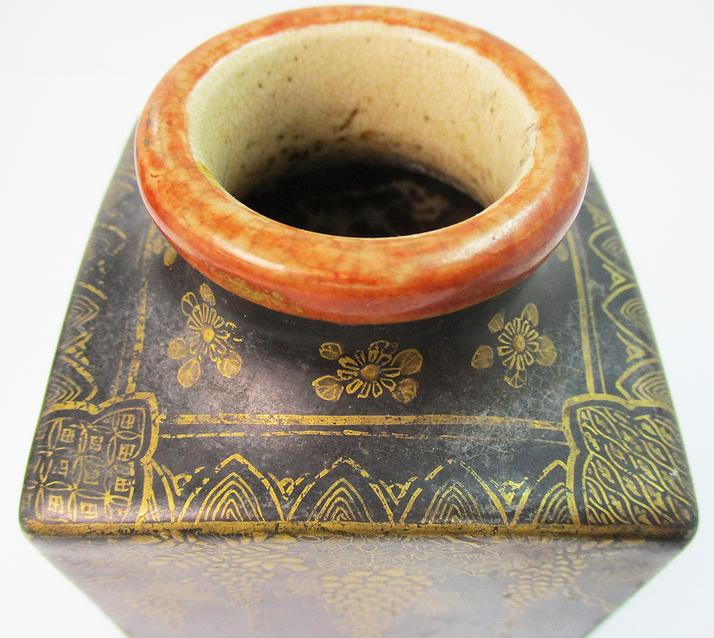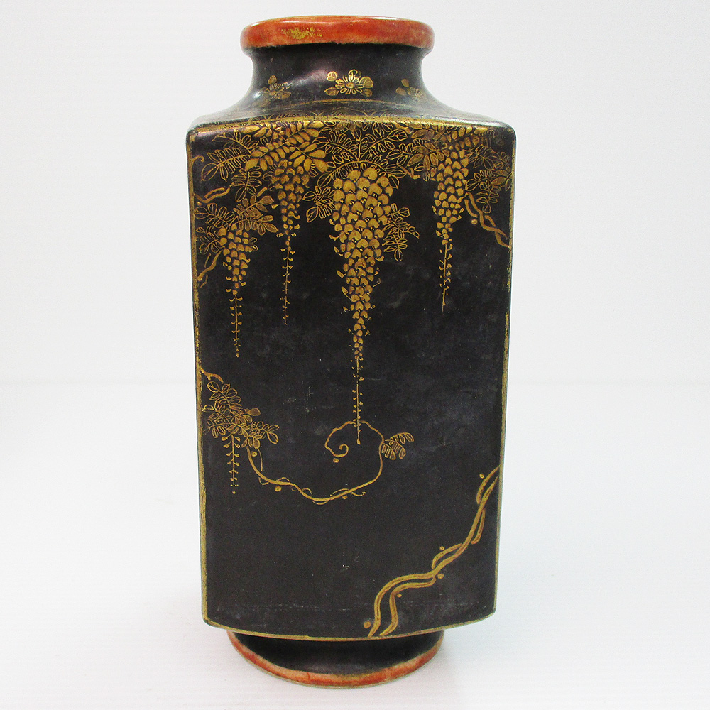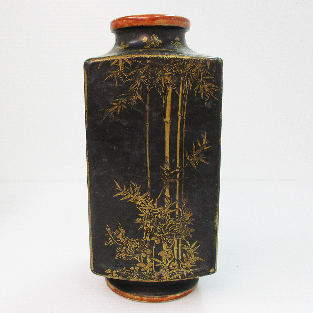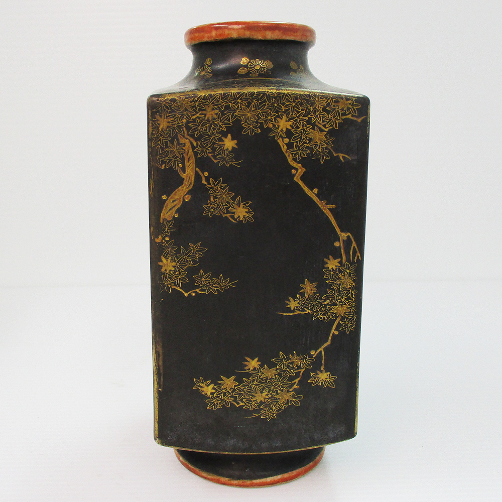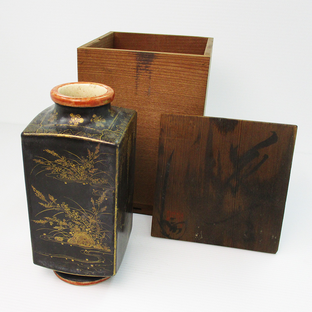 薩摩焼? 黒地金彩 四季花文 方形花瓶 明治期? 四角花びん 時代物 共箱 藤・楓・竹・秋草文 蔵出し 陶磁器 中古 #0726-001T4 收藏