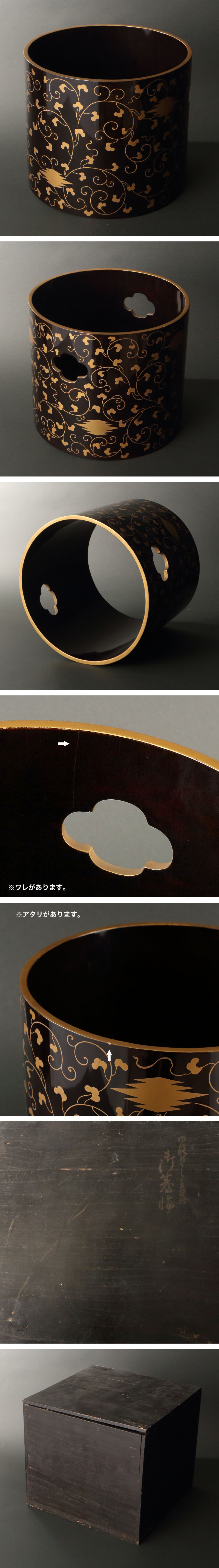 江戸後期の台輪(輪台)です。 台輪は歯黒化粧に用いる鉄漿道具の一つで、口を漱ぐための耳盥を上に置きます。 本作は五階菱(掻摺菱、霞菱)文から、越後新発田藩主を務めた溝口家の婚礼調度のひとつと推察されます。 堂々たる逸品です。 ◆溝口家 中世~近代の武家・華族。溝口秀勝が豊臣秀吉の下で越後新発田6万石の大名に取り立てられ、江戸期にも新発田藩主家として続き、維新後伯爵家に列する。 付属:識箱が付属します。 寸法:高さ22.5cm、幅25.5cm(最大幅。若干の誤差はご了承下さい) 状態:経年感、複数ワレ、複数アタリ、内側下部に少々貼り紙跡がございます。 |