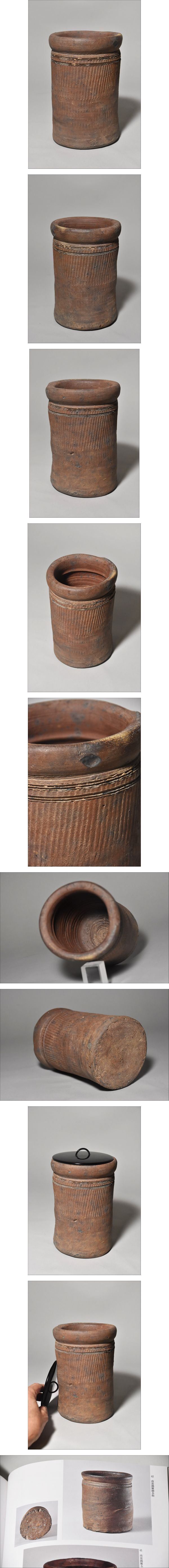 | 商品説明 | 「南蛮縄簾文筒壺(16~18世紀)」です。 胴に縦筋の細い筋目(櫛目)の入る 南蛮陶の中でも人気のあった”縄簾(なわすだれ)文”です。 もう少し大振りの水指サイズが多いのですが、 出品の品は、筆筒ほどの寸法です。 口縁の小ソゲ程度、状態は良く水も直接入ります。 どうか、よろしくお願いいたします。 参考写真:「南蛮・島物(根津美術館刊)」に載る縄簾文水指