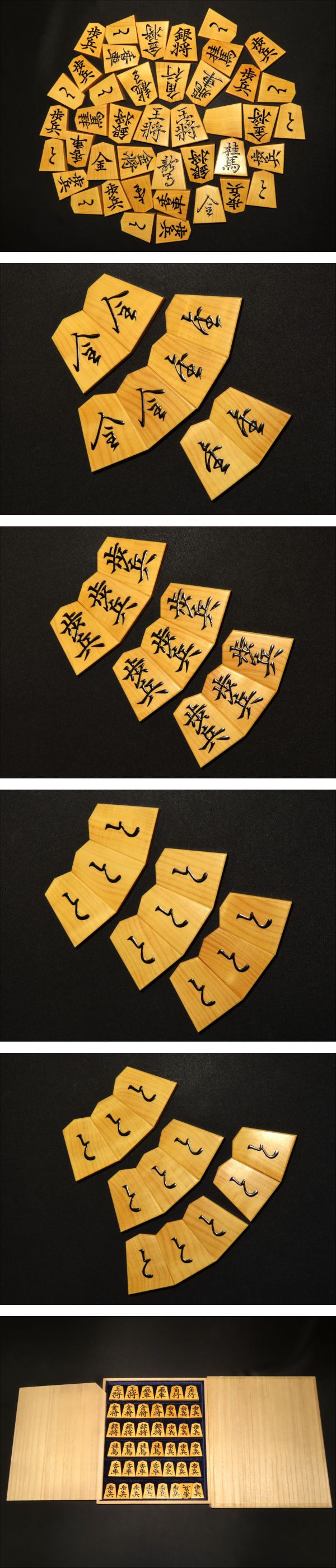 木地は御蔵島黄楊根柾。ご覧の通り非常に味の良い木地です。全ての駒の表裏をUPしてございます。是非ご覧下さい。
