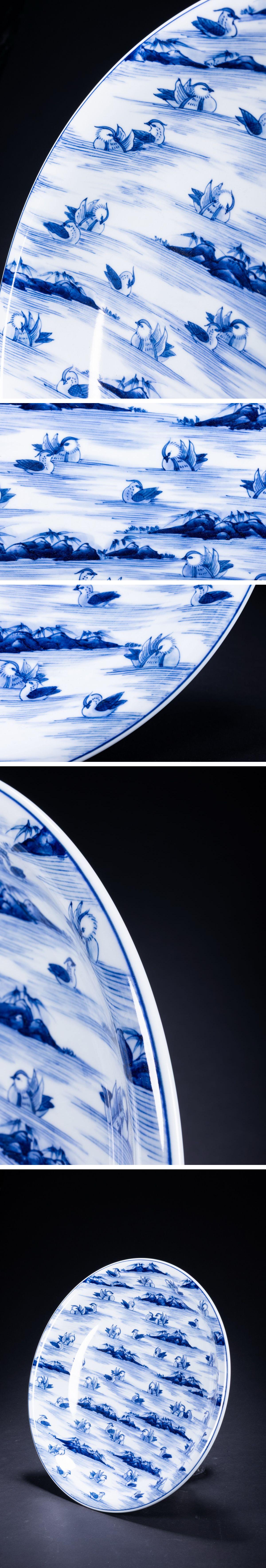 【珍品堂】1円から 有田焼 源右衛門窯 染付 鴛鴦図 皿 大皿 共箱 木箱 径33.5cm 和食器 懐石 伝統工芸 時代物 骨董品 古美術 N-A63-1 收藏