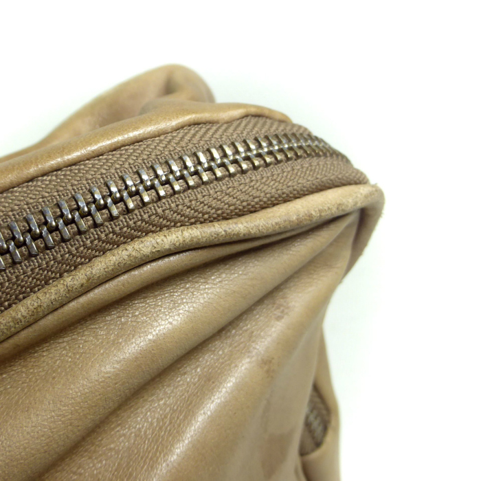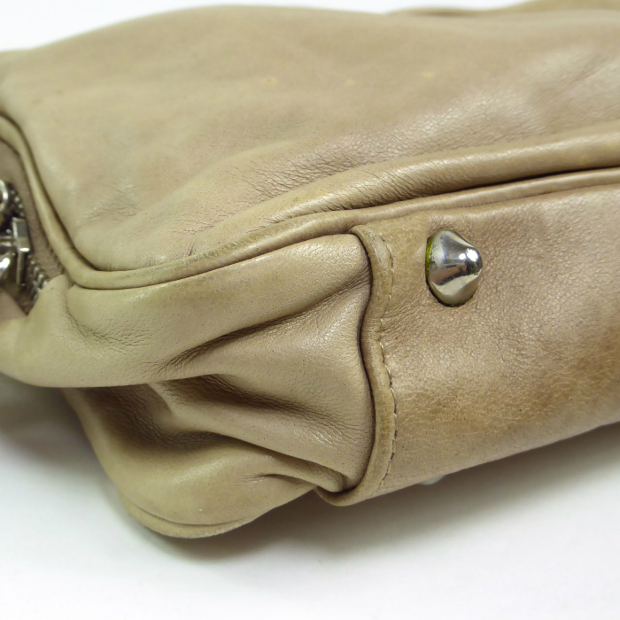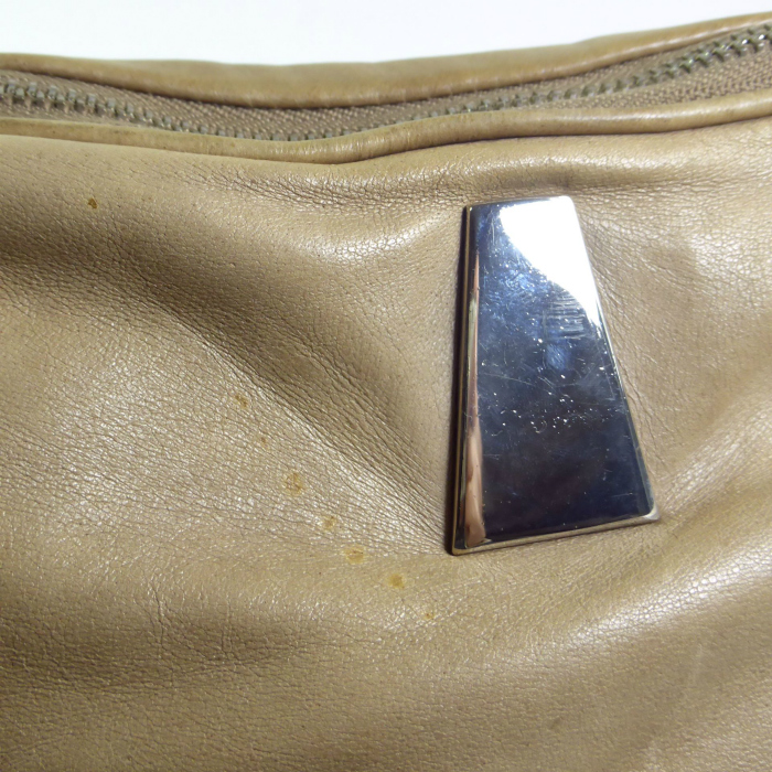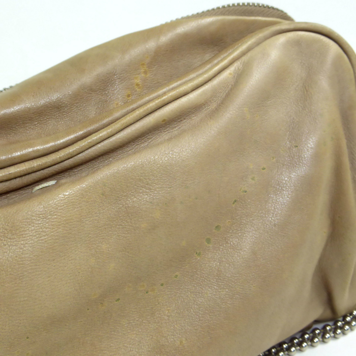 | レザー全体の所々にシミや汚れ、スレ、色ヤケ、金具にスレや小キズ、くすみ、底鋲の付け根に変色、内側生地に若干の汚れなどが見受けられます。 |