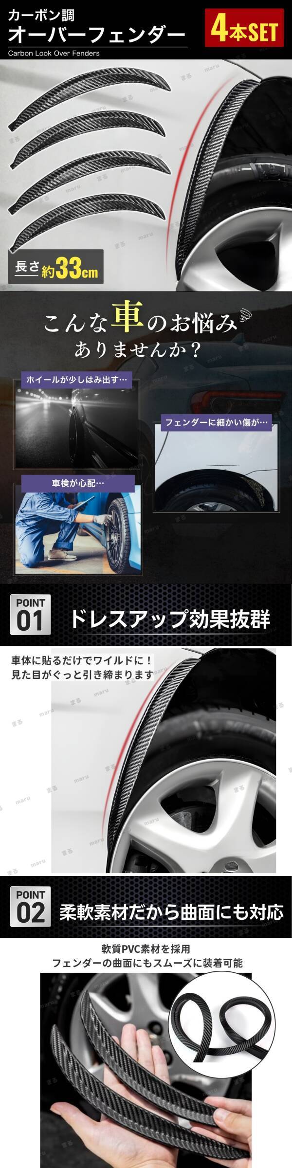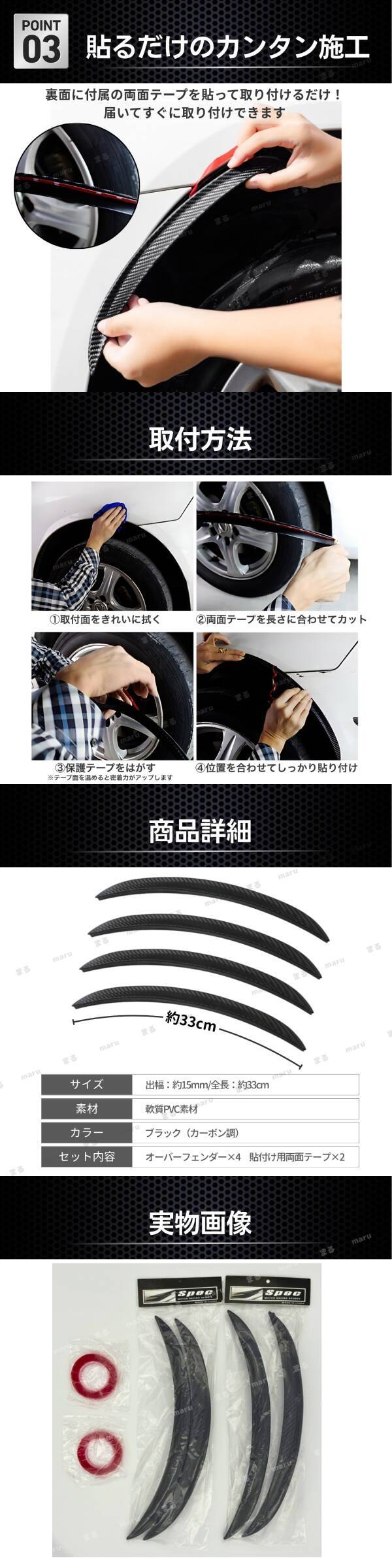 オーバーフェンダー モール 33cm 出幅15mm 4本セット 汎用 カーボン柄 ブラック ハミタイ 対策 ドレスアップ ツライチ 曲がる 泥除け 車検 收藏