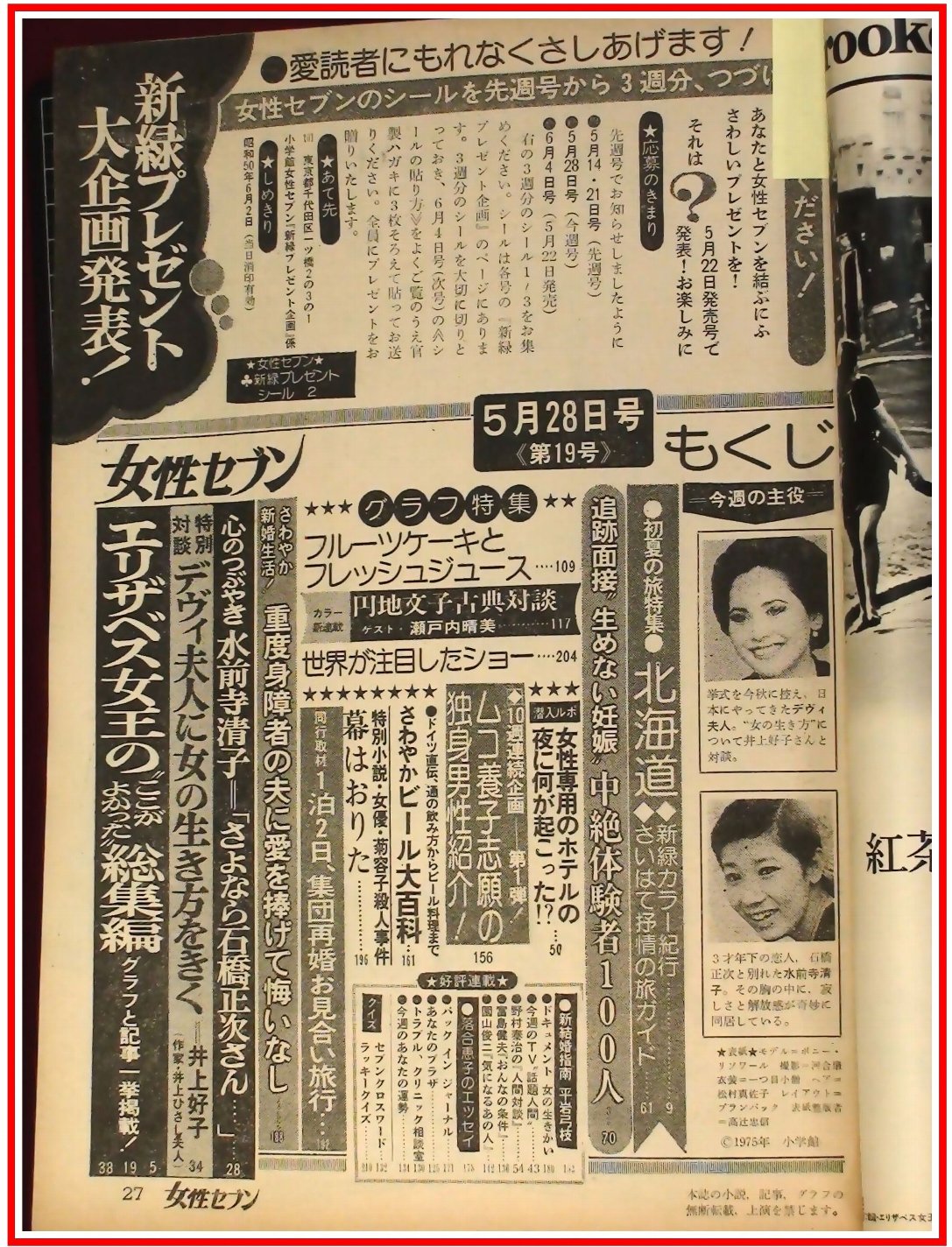 p1832『女性セブン 昭和50年5/28 no.594』水前寺清子/デヴィ夫人/かまやつひろし/三田悠子/円地文子/瀬戸内晴美/エリザベス女王 收藏