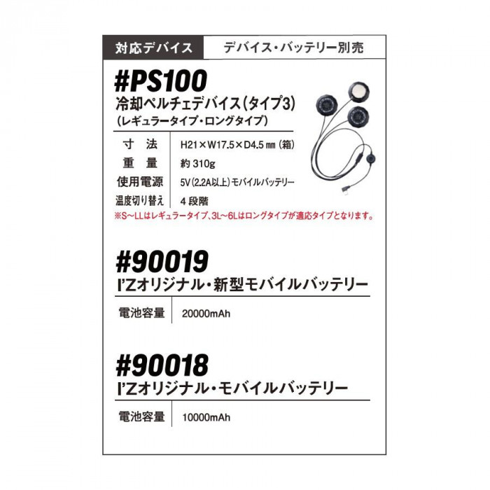 | 仕様 | ・冷却ペルチェ対応ウェア(冷却ペルチェ・バッテリーは付属しません) ・カラー:ホワイトディシーブ |