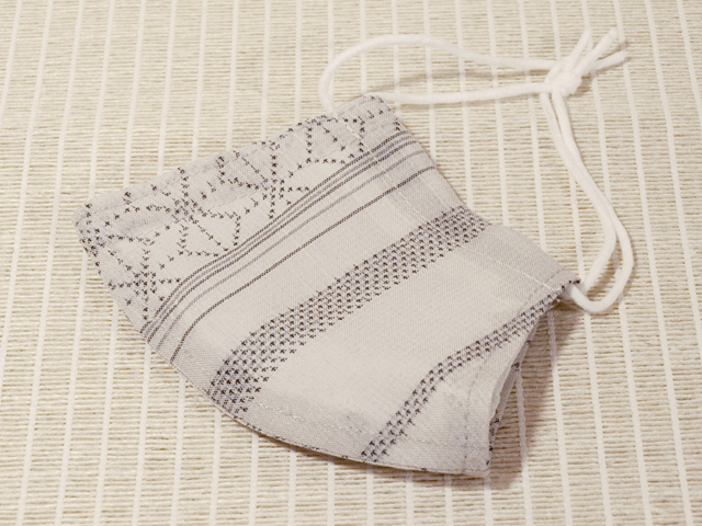 絹鼠(きぬねず)色がかったきなり色の地に紺青(こんじょう)色の絣で麻葉の配されたよこ縞の文様が織り込まれている、夏紬地の和装マスクカバーです。日本国内製ハンドメイドのお品です。ノーズワイヤーが入っており、交換も可能です。裏地には白色無地の阿波しじら織の綿地が配されています。 十日町で織られた夏着物用の未使用の織地から製作されたもので、透け感があり、涼やかです。裏地の阿波しじら織はシボの凹凸があり、強い吸湿性と高い速乾性があるので、肌にまとわりつかず、快適です。裏地との間にはポケットがあり、フィルターを入れていただければ本格的なマスクになります。また、マスクなので夏季以外にお使いいただいても問題はありません。耳掛けのゴムはご自身で調節の上、結び目をマスク端部のループ内に入れることができます。 新品です。未使用の織地を素材としているので、気持ち良くお使いいただけます。ハンドメイドですので、若干の縫製のムラ、ゆれなどはあるかもしれませんが、ご理解、ご了承くださいませ。 |